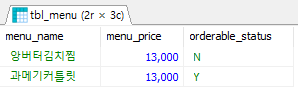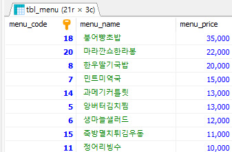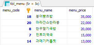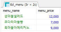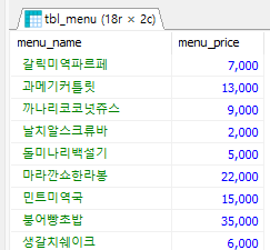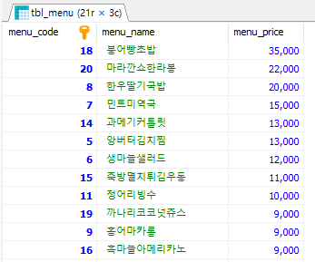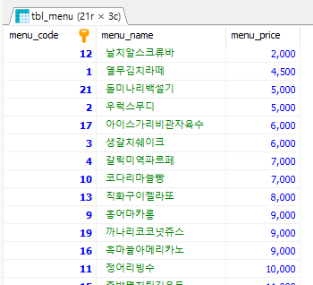 -- ORDER BY menu_price ASC; -- ์ค๋ฆ์ฐจ์(default)