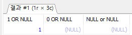 SELECT 1 OR NULL, 0 OR NULL, NULL or NULL;