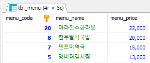 -- ORDER BY menu_price DESC; -- ๋ด๋ฆผ์ฐจ์