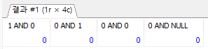 SELECT 1 AND 0, 0 AND 1, 0 AND 0, 0 AND NULL;