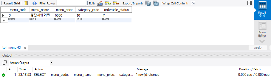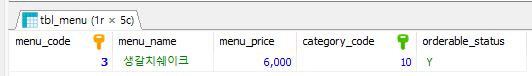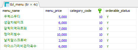 INSERT INTO tbl_menu VALUES (null, '๋ ์น์์คํฌ๋ฅ๋ฐ', 2000, 10, 'Y');