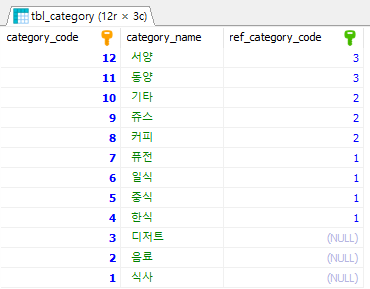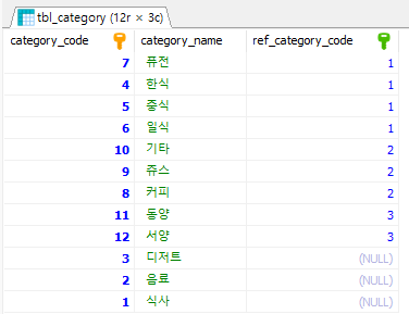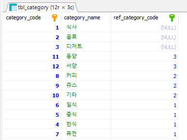 INSERT INTO tbl_category VALUES (null, '์์', 3);