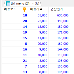 , menu_code * menu_price AS '์ฐ์ฐ๊ฒฐ๊ณผ'