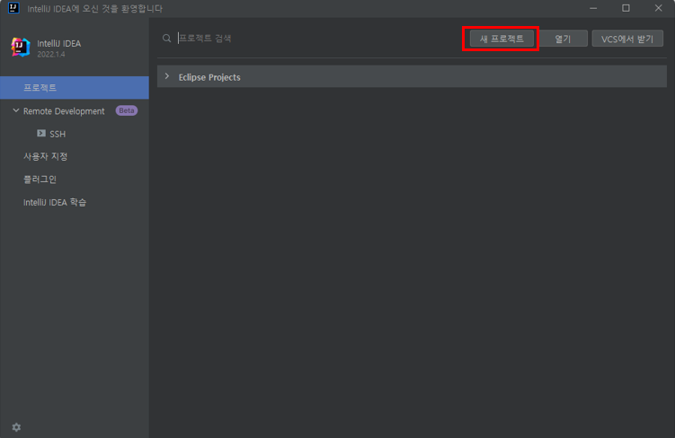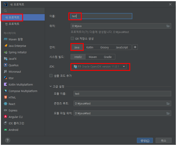 ์ ํ๋ก์ ํธ ํญ์์ ํ๋ก์ ํธ ์ด๋ฆ๊ณผ JDK ๋ฒ์ ์ค์ ์ธํ ํ ์์ฑ์ ๋๋ฅธ๋ค.