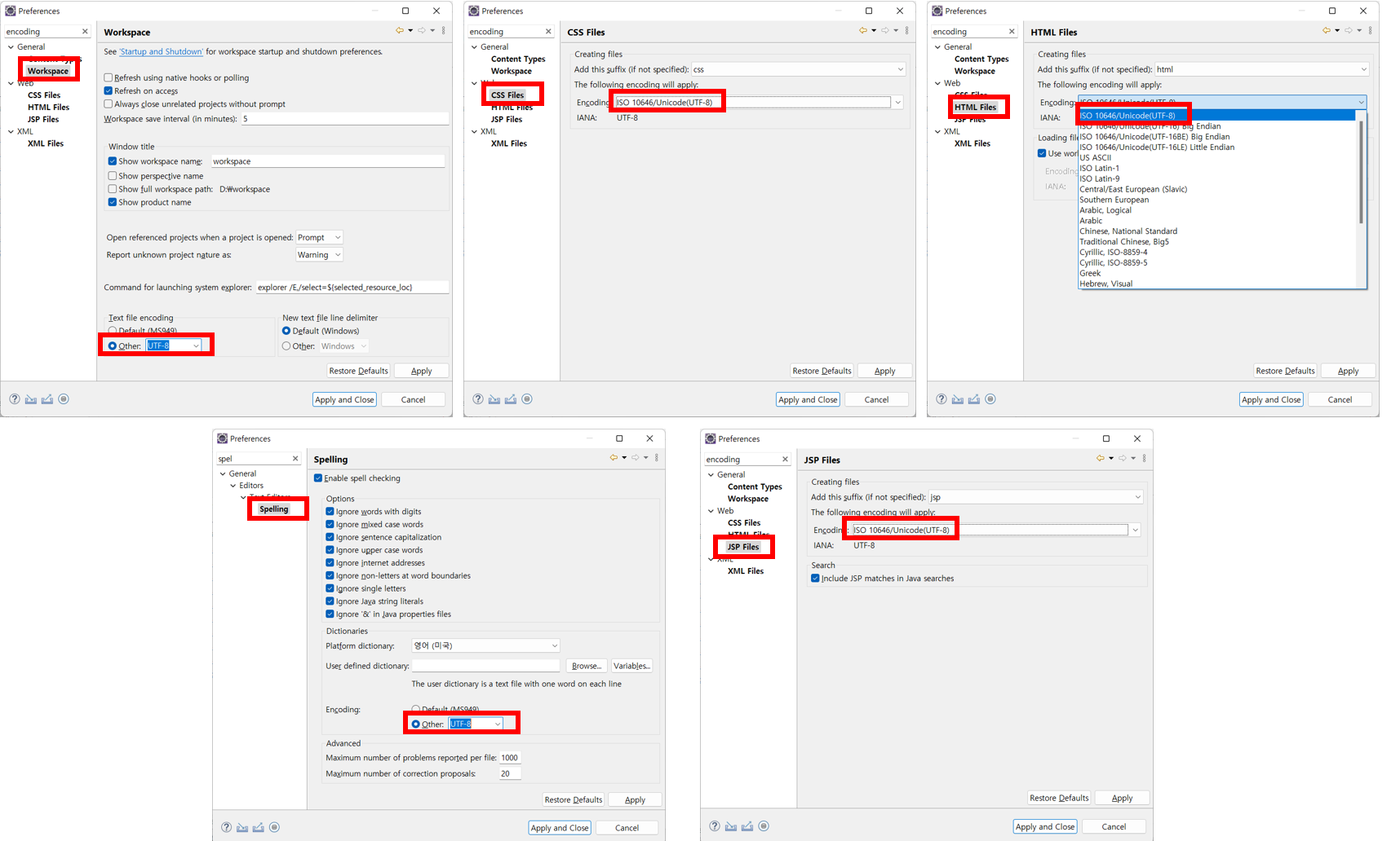 Window โ Preferences ๋ก ๋ค์ด๊ฐ์ encoding, spell ์ ๊ฒ์ํ๊ณ ํ์ํ ํญ์์ UTF-8 ๋ก ๋ณ๊ฒฝํด์ค๋ค.