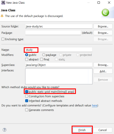 ํด๋์ค ์ด๋ฆ๊ณผ public static void main(โฆ) ์ ์ฒดํฌํ ํ Finish ๋ฅผ ๋๋ฅธ๋ค.