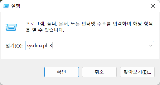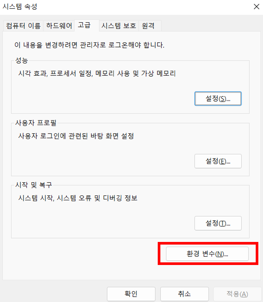 ์ดํ์ ์์ถ ํด์ ํ jdk๋ฅผ ์์คํ ํ๊ฒฝ ๋ณ์์ ๋ฑ๋ก์ ํด์ฃผ์ด์ผ ํ๋ค. Windows + R ๋ฒํผ์ ๋๋ฌ ์คํ์ฐฝ์ด ์ด๋ฆฌ๋ฉด sysdm.cpl ,3 ์ ์ ๋ ฅํ๋ค. ์์คํ ์์ฑ ์ฐฝ์ด ์ด๋ฆฌ๋ฉด ํ๊ฒฝ ๋ณ์ ๋ฒํผ์ ๋๋ฅธ๋ค. (or Window ํค ๋๋ฅด๊ณ ํ๊ฒฝ ๋ณ์ ๊ฒ์)