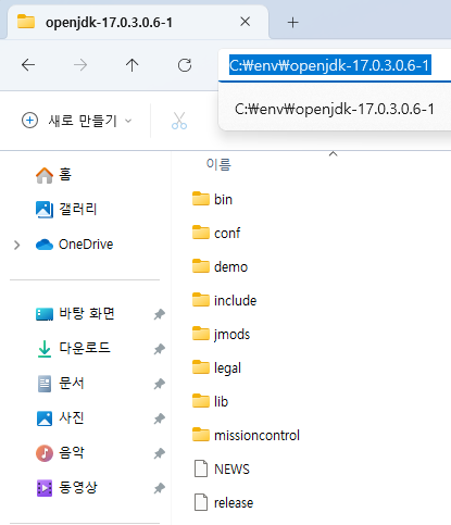 ์์ถ ํด์ ํ JDK ํด๋์ ๊ฒฝ๋ก๋ฅผ ๋ฏธ๋ฆฌ ๋ณต์ฌํด๋๋ค.(bin ํด๋๊ฐ ๋ณด์ด๋ ์์น์ ๊ฒฝ๋ก๋ฅผ ๋ณต์ฌํ๋ค)