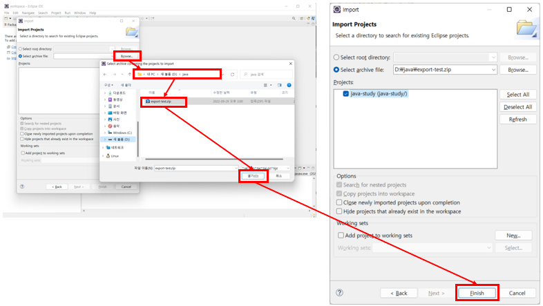 export ํ ํ์ผ์ ์์น๋ฅผ ์ฐพ์์ Finish๋ฅผ ๋๋ฌ ํ๋ก์ ํธ๋ฅผ Import ํ๋ค.