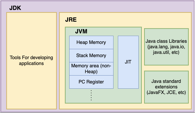 JDK๋ JRE๋ฅผ ํฌํจํ๊ณ ์๋ค. Java ํ๋ก๊ทธ๋จ์ ์คํ๋ง ํ๋ค๋ฉด JRE๋ง ์ค์นํ๋ฉด ๋์ง๋ง, Java ํ๋ก๊ทธ๋๋ฐ์ ํ๋ค๋ฉด JDK๋ฅผ ์ค์นํด์ผํ๋ค.