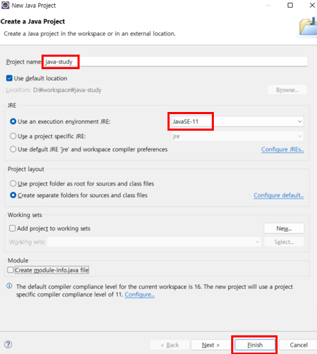 ํ๋ก์ ํธ ์ด๋ฆ๊ณผ Java ๋ฒ์ ์ 11๋ก ์ธํ ํ ํ Finish ๋ฅผ ๋๋ฅธ๋ค.