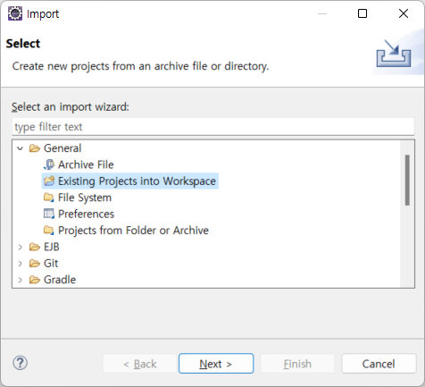 General โ Existing Projects into Workspace ๋ฅผ ์ ํํ Next๋ฅผ ๋๋ฅธ๋ค