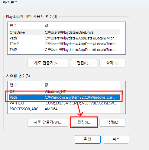 ์์คํ ๋ณ์๋ฅผ ์ ๋ ฅํด ์ค ๋ค์์ ์์คํ ๋ณ์ํญ์ Path๋ฅผ ํด๋ฆญํ๊ณ ํธ์ง์ ๋๋ฅธ๋ค.