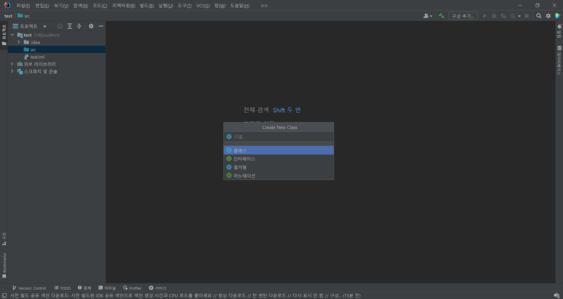 src ์ค๋ฅธ์ชฝ ํด๋ฆญ โ ์๋ก ๋ง๋ค๊ธฐ โ Java ํด๋์ค โ ํด๋์ค ์ ํ โ ํด๋์ค ์ด๋ฆ ์ค์ ํ ์ํฐ