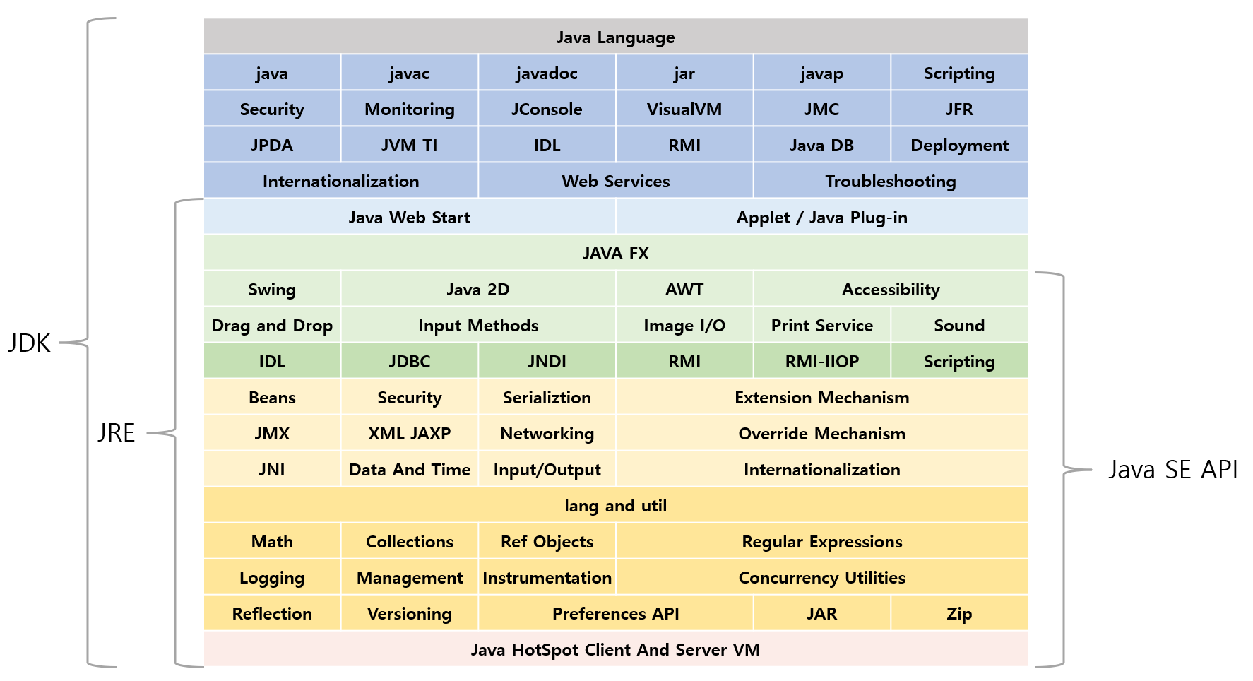 ํ์ค์ ๊ฐ๋ฐ ํ๊ฒฝ์ ์ง์ํ๋ ์๋ฐ ๊ฐ์ ๋จธ์ ๊ท๊ฒฉ ๋ฐ API๋ฅผ ํฌํจํ๋ค.์ฆ ์๋ฐ ์ธ์ด๋ผ๊ณ ํ๋ ๋๋ถ๋ถ์ ํจํค์ง๊ฐ ํฌํจ๋ ์๋์ ์ด๋ค.
