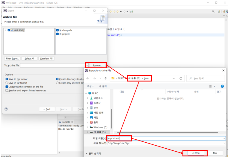 Browse ๋ฅผ ๋๋ฅด๊ณ ์ ์ฅํ ๊ฒฝ๋ก๋ฅผ ์ฐพ๊ณ export ํ ํ์ผ์ด๋ฆ์ ์ง์ ํ ๋ค ์ ์ฅ์ ํด๋ฆญ ํ Finish ๋๋ฅธ๋ค.