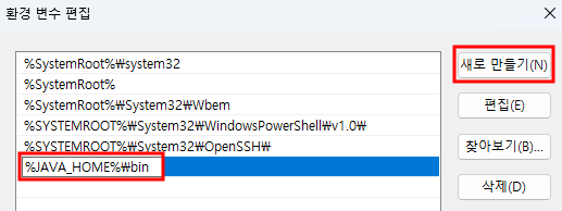 ์๋ก ๋ง๋ค๊ธฐ๋ฅผ ๋๋ฅด๊ณ %JAVA_HOME%\bin ์ ์ถ๊ฐํ๋ค. ์ถ๊ฐํ ๋ผ์ธ์ ์๋ก ์ด๋์ ๋๋ฌ ์๋จ์ผ๋ก ์ด๋์ํจ ํ ํ์ธ์ ๋๋ฅธ๋ค. (์๋จ์ผ๋ก ์ด๋์ํจ ์ด์ ๋ ๋ช ๋ น์ด๋ฅผ ์ฐพ์ ๋ Path ํ๊ฒฝ ๋ณ์์ ๋ฑ๋ก๋ ์์๋๋ก ์ฐพ๊ธฐ ๋๋ฌธ์ด๋ค.)