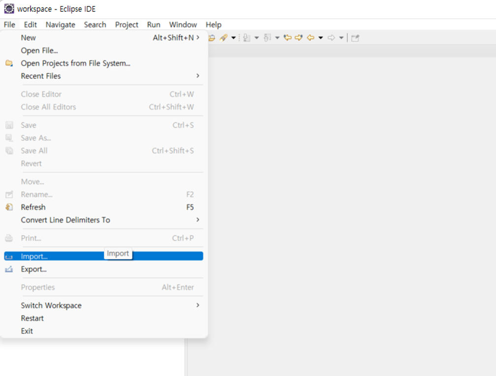 Export ํ ํ๋ก์ ํธ๋ฅผ Import ๋ฅผ ์งํํ๊ธฐ ์ํด์๋ File โ Import ๋ฅผ ํด๋ฆญํ๋ค.