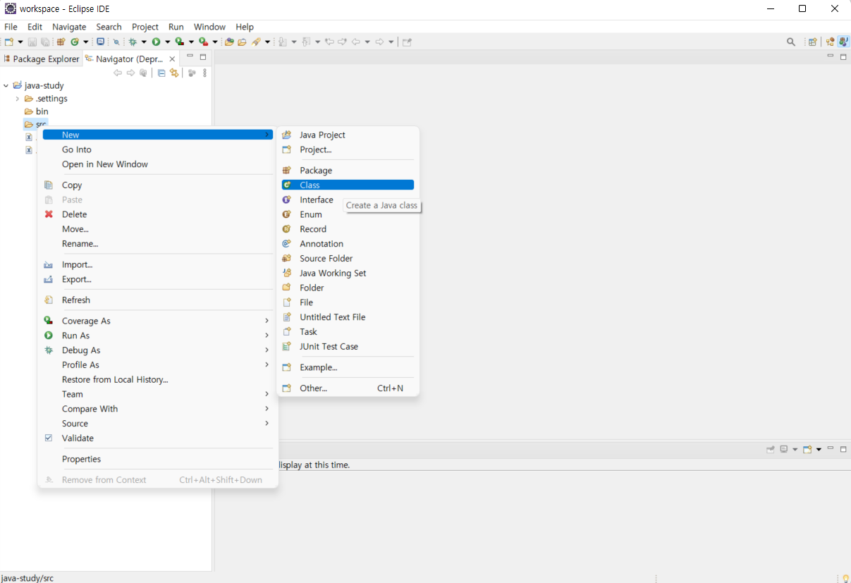 src ํด๋ ์ค๋ฅธ์ชฝ ํด๋ฆญํ ํ New โ Class ๋ก ํด๋์คํ์ผ์ ๋ง๋ ๋ค.