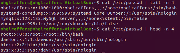 💡 head 명령어를 사용하면 파일의 처음 부분을, tail 명령어를 사용하면 파일의 마지막 부분을 출력할 수 있다.