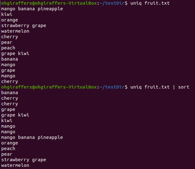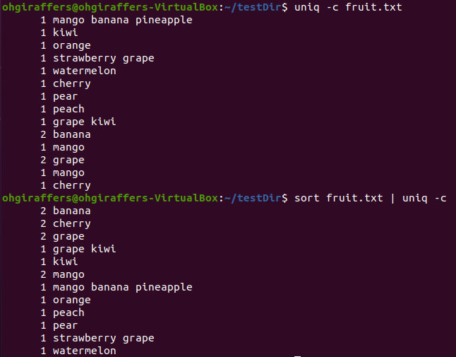 💡 -c 옵션을 주어 중복 데이터 개수를 셀 수도 있다.