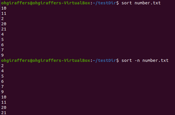 💡 -n 옵션을 추가하면 내용이 문자열이 아닌 숫자로 판단한다.