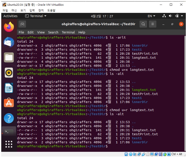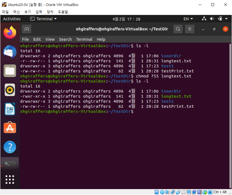💡 파일 또는 디렉토리의 권한을 변경하는 명령어이다. 권한 변경은 슈퍼 유저나 파일/디렉토리 소유주만 가능하다.