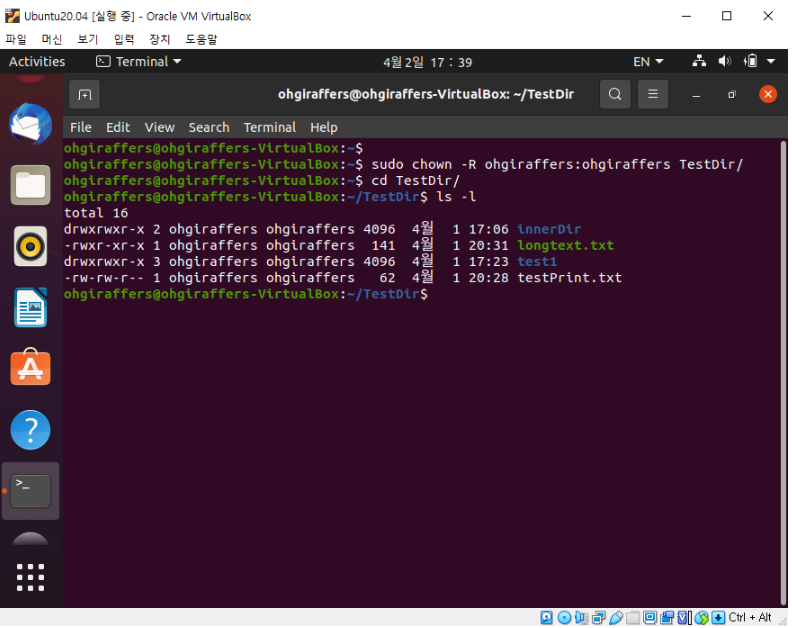 - -R 옵션: 하위 디렉토리까지 모든 소유권 적용
