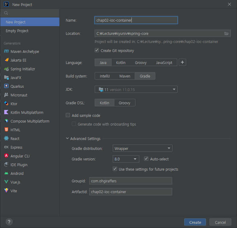 Location : ์ ์ฅ ๊ฒฝ๋กCreate Git repository ์ฒดํฌํ๋ฉด ์๋์ผ๋ก Git Local ์ ์ฅ์๊ฐ ์์ฑ ๋๋ค.Language : JavaBuild system : GradleJDK : 11Gradle DSL : KotlinGroupId : com.ohgiraffersArtifactId : ํ๋ก์ ํธBuild System์ ์ํํธ์จ์ด๋ฅผ ๋น๋ํ๊ณ ํจํค์งํ๋ ๋ฐ ์ฌ์ฉ๋๋ ๋๊ตฌ์ด๋ค. ์ํํธ์จ์ด ๊ฐ๋ฐ์ ์์ฐ์ฑ๊ณผ ํจ์จ์ฑ์ ํฅ์์ํค๊ธฐ ์ํด ์๋ํ ์์