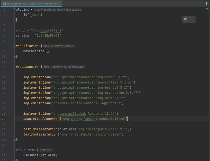 build.gradle ํ์ผ์ ์ ์ฅํ๊ณ , IntelliJ์์ Reload Changes ๋ฒํผ์ ๋๋ฅธ๋ค.