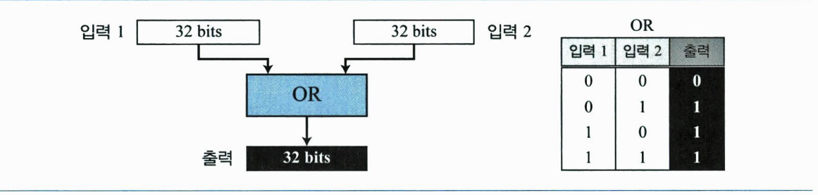 비트 단위 OR 연산은 이항 연산으로 두 개의 입력을 취한다. OR 연산은 두 수에 해당하는 비트들을 비교하여 둘 중에서 큰 값을 취한다. 같은 경우에 둘 중의 하나를 취한다. 다음 그림은 OR연산을 보여준다.