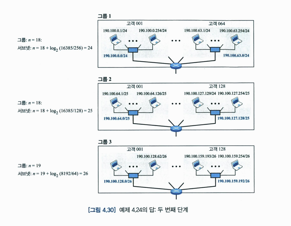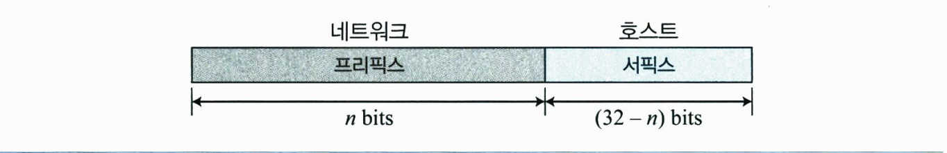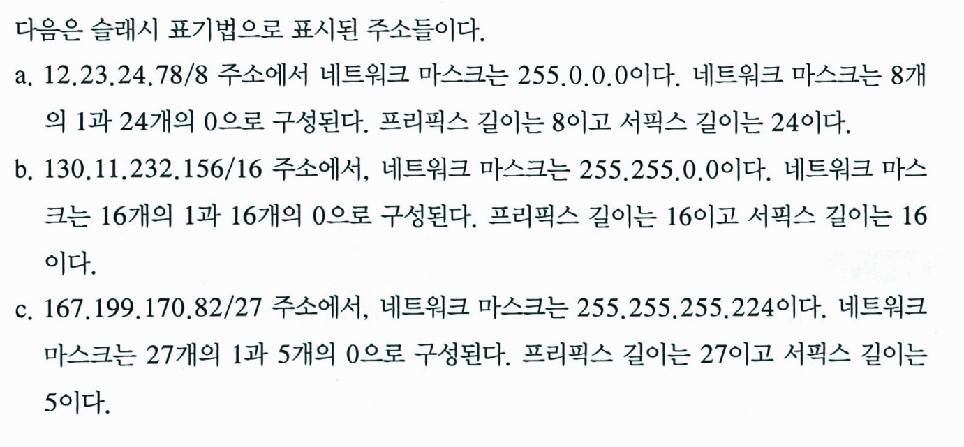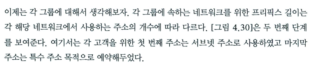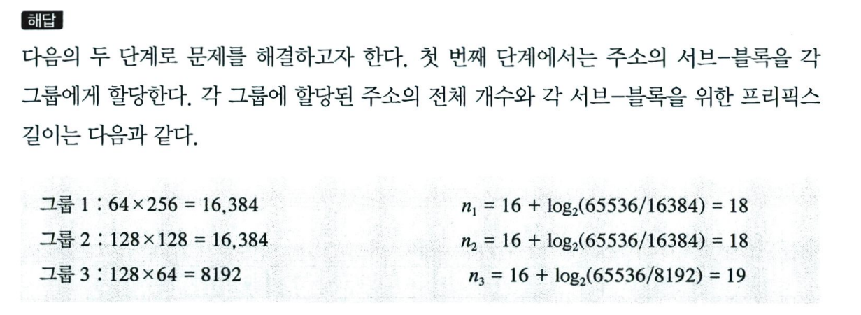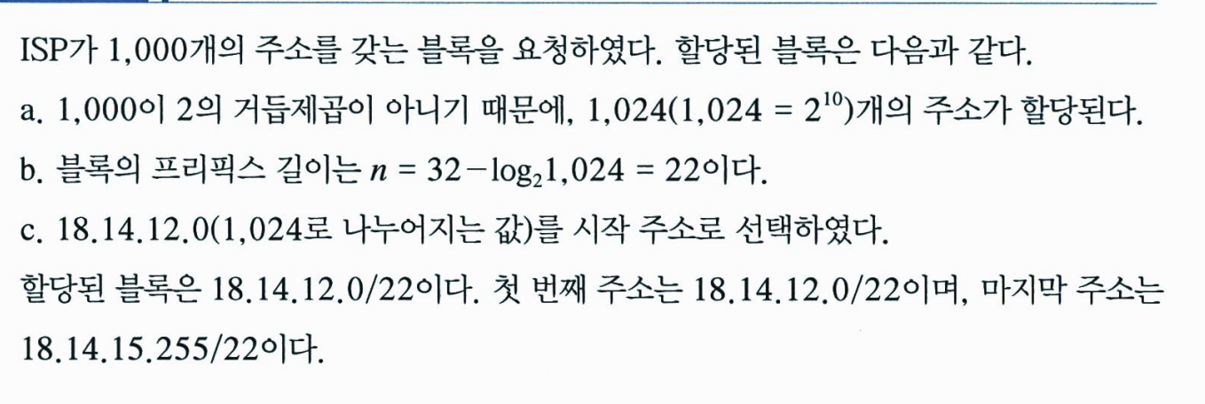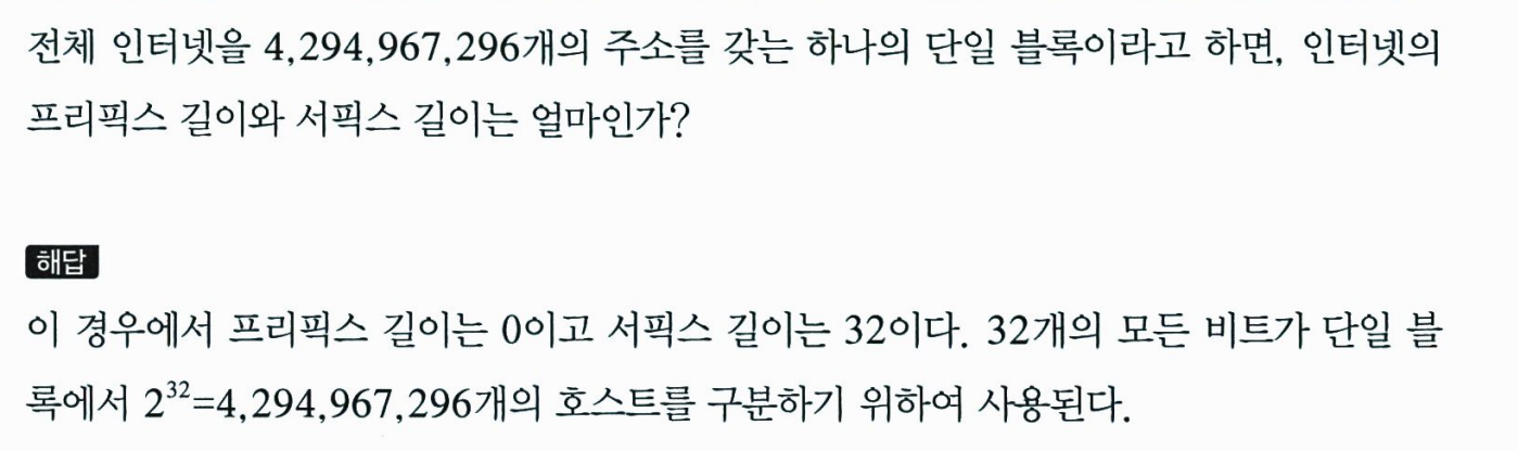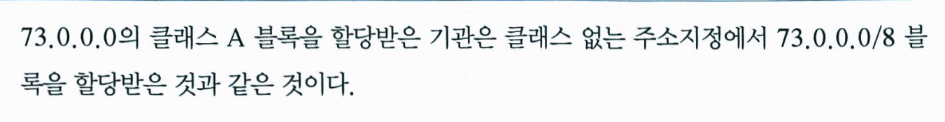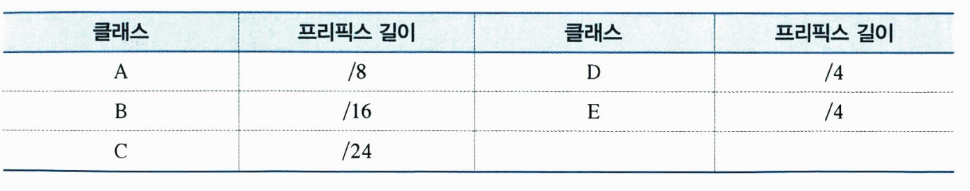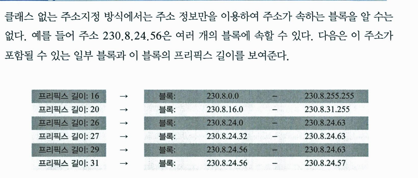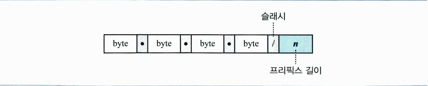 - 클래스 없는 주소지정 방식에서는 블록 내의 주소만 가지고는 프리픽스 길이를 알 수 없다. 주소는 임의의 프리픽스 길이를 갖는 블록에 속한다.