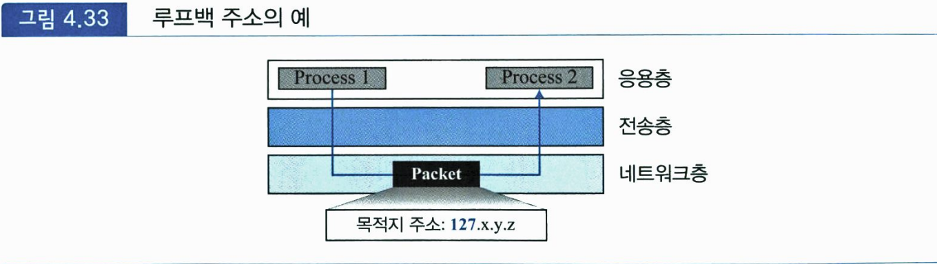 127.0.0.0/8 블록은 루프백 주소(loopback address)로 사용된다. 루프백 주소는 컴퓨터 내에 설치된 소프트웨어를 시험하기 위하여 사용되는 주소이다. 이 주소를 사용하는 패킷은 컴퓨터 외부로 전송되지 않고 단순히 프로토콜 소프트웨어로 보내진다. 클라이언트 프로세스(실행 중인 응용 프로그램)가 동일한 컴퓨터에 있는 서버 프로세스로 메시지를 전송하는 경우에 사용될 수 있다. 루프백 주소는 IPV4 패킷의 목적지 주소로만 사용 될 수 있다.