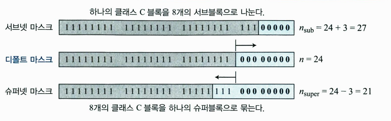 슈퍼넷 마스크(supernet mask)는 서브넷 마스크의 반대이다. 클래스 C에서 서브넷 마스크느는 이 클래스의 디폴트 마스크보다 1의 개수가 더 많다. 클래스 C의 슈퍼넷 마스크는 이 클래스의 디폴트 마스크보다 1의 개수가 더 적다.