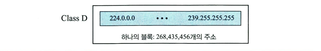 클래스 D 주소는 단지 한 블록이다. 따라서 클래스 D는 이후에 살펴볼 멀티캐스팅을 위해 설계되었다. 클래스 D의 각 주소는 인터넷상에서 호스트들의 한 그룹을 정의하는데 사용된다. 그룹에 클래서 D의 주소가 할당되면, 이 그룹의 멤버인 모든 호스트는 정상적인 주소(유니캐스트)에 추가적으로 멀티캐스트 주소를 갖게 되는 것이다.