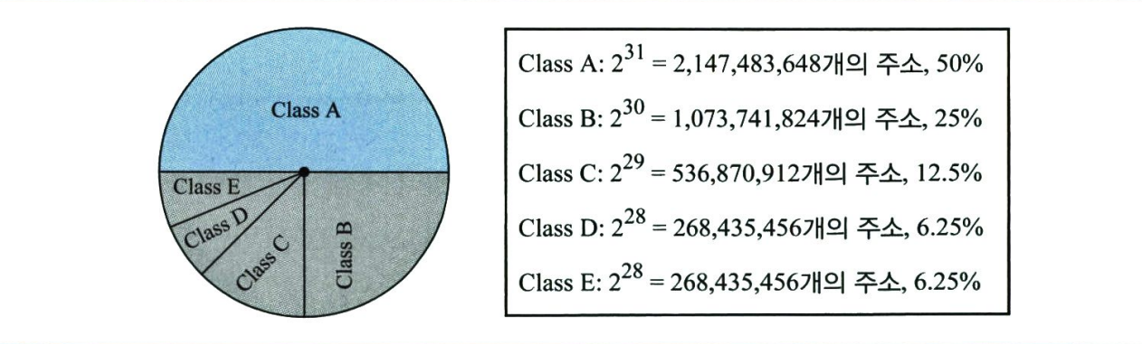 클래스 기반 주소지정에서 IP 주소 공간은 다섯 개의 클래스(A, B, C, D, E)로 나누어진다. 각 클래스는 전체 주소 공간의 일부분을 차지한다. 다음 그림은 주소 공간에 대한 각 클래스의 점유율을 보여준다.