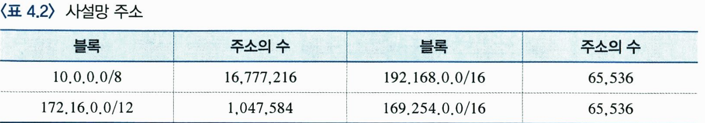 여러 블록이 사설 용도를 위하여 할당되었다. 이 주소들은 전역 네트워크에서 인식되지 않는다. 이 주소들은 네트워크가 분리되어 있거나 또는 주소 변환 기술(NAT: Network Address Translation)을 사용하여 사설 망(private network)을 인터넷에 연결하는 데 사용된다.