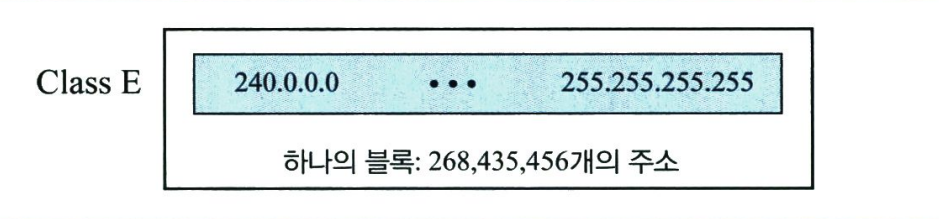 클래스 E 주소도 단 하나의 블록을 갖는다. 다음 그림과 같이 클래스 E는 예약된 주소로 사용하기 위해 설계되었다.