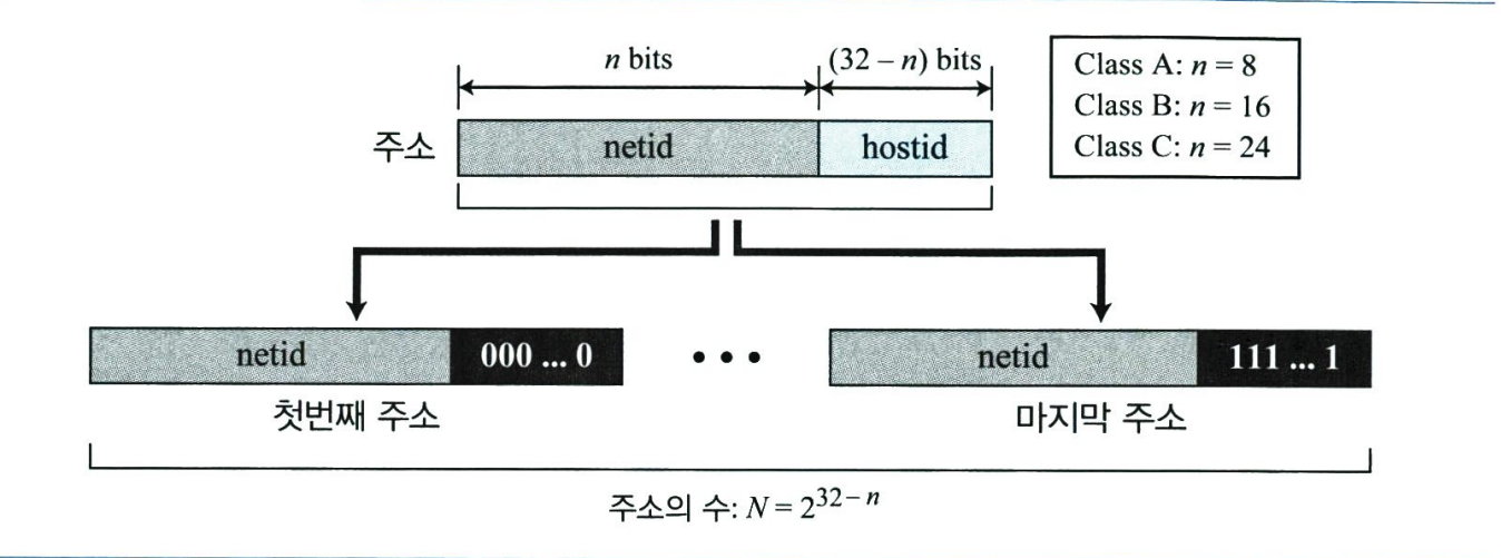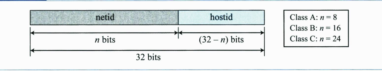 네트워크 내의 모든 주소는 한 블록에 속하므로 클래스 기반 주소지정에서는 각 주소는 netid와 hostid 부분을 포함한다. Netid는 네트워크를 정의하고 hostid는 네트워크에 연결된 특정 호스트를 정의한다. 다음 그림은 클래스 기반 주소지정에서 IPv4 주소를 보여준다. 클래스 내의 n 비트가 네트워크를 정의하면 32-n 비트는 호스트를 정의한다. 그러나 n의 값은 블록이 속한 클래스에 따른다. n의 값은 클래스가 A,B,C인가에 따라 각각 8, 16 또는 24가 될 수 있다.