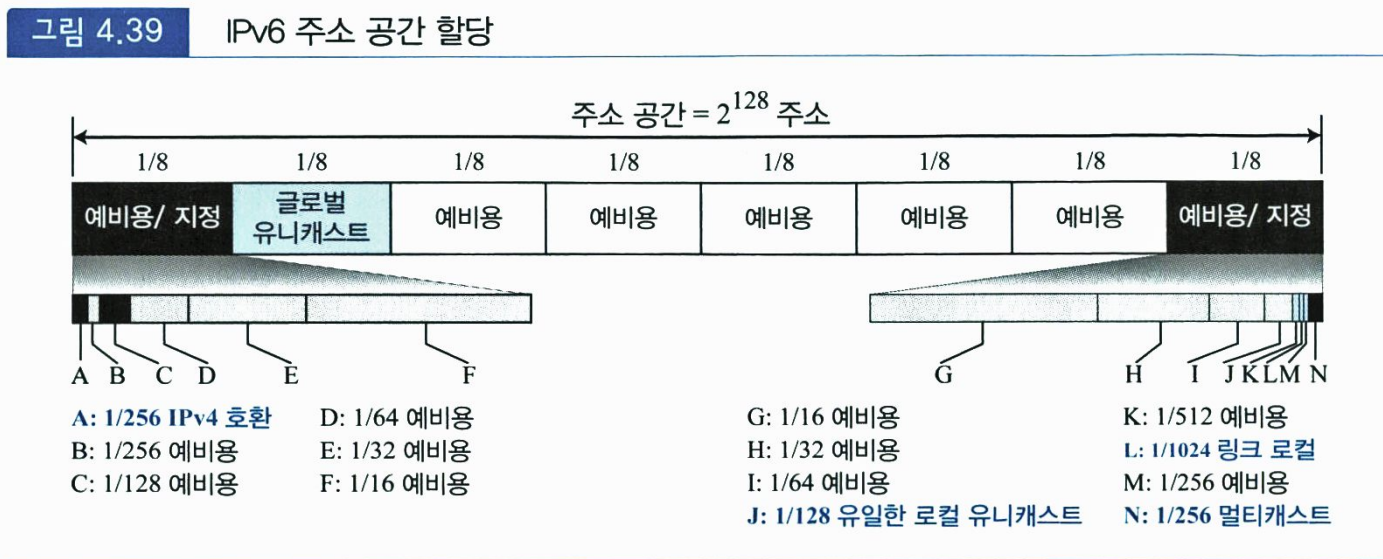 IPv6의 주소 공간은 2의 128승이다. (절대로 주소가 고갈되지 않는다.)