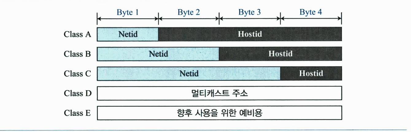 클래스 기반 주소지정에서 클래스 A, B, C의 IP 주소는 네트워크를 구분하는 netid와 호스트를 구분하는 hostid로 나누어진다. 각 부분은 주소의 클래스에 따라 길이가 서로 다르다. 다음 그림은 netid와 hostid의 바이트를 보여주고 있다. 클래스 D와 E는 netid와 hostid로 나누어지지 않으며, 이에 대한 설명은 뒤에서 살펴본다.