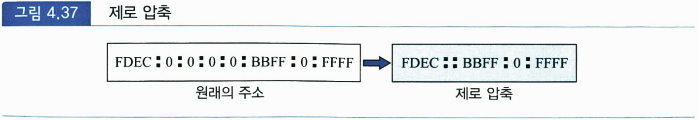 제로 압축(zero compression)이라는 생략법은 0으로만 구성된 연속된 섹션이 있는 경우에 0을 모두 지우고 두 개의 콜론으로 대체할 수 있다.