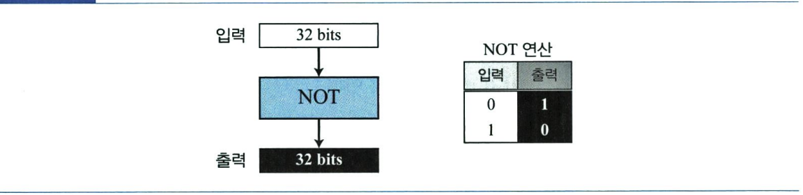 비트 단위의 NOT 연산은 일한 연산(unary operation)으로 한 개의 입력을 받는다. 수에 NOT 연산을 취하면 그 수에 대한 보수를 계산하는 것이다. 2진법으로 표시된 32비트 수에 NOT 연산을 적용하면 각 비트의 역이 취해진다. 다음 그림은 NOT 연산을 보여준다.