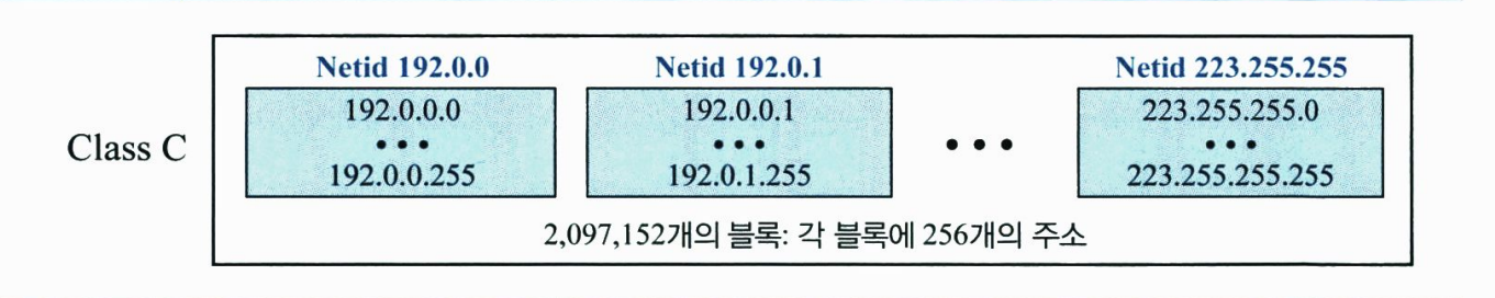 클래스 A는 1바이트의 netid와 3비트의 hostid를 갖는다. 클래스 B는 2바이트의 netid와 2바이트의 hostid를 갖는다. 클래스 C의 경우, netid가 3바이트이고, hostid는 1바이트로 나타낸다.