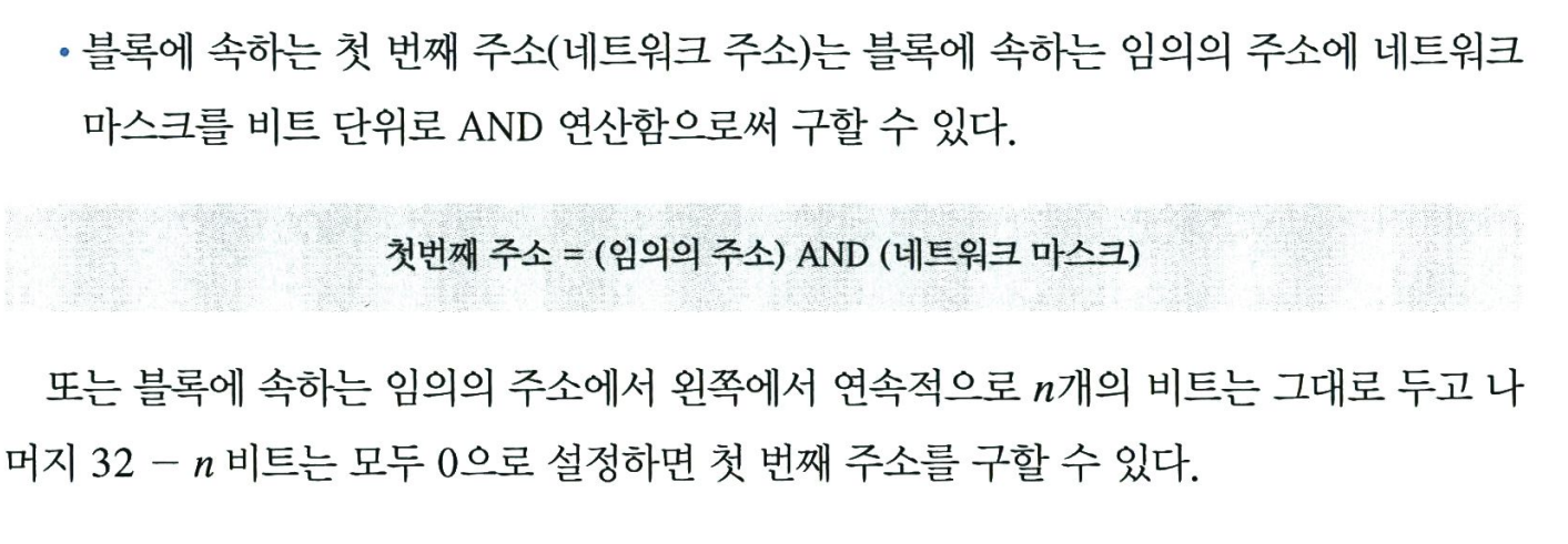 - 처음 주소는 왼쪽의 n비트를 유지하고 오른쪽의(32-n)비트를 0으로 함으로써 구할 수 있다.