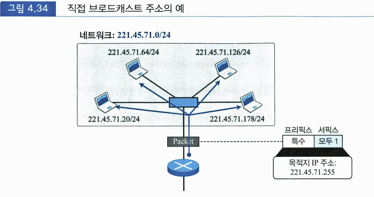 서픽스가 모두 1로 설정된 블록 또는 서브-블록의 마지막 주소는 직접 브로드캐스트 주소(direct broadcast address)로 사용된다. 이 주소는 일반적으로 라우터가 특정한 네트워크에 있는 모든 호스트에게 패킷을 전송하기 위하여 사용된다. 이 주소는 IPv4 패킷에서 목적지 주소로만 사용할 수 있다.