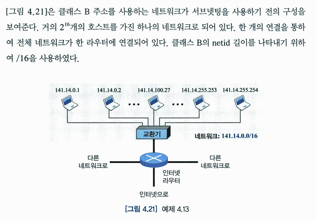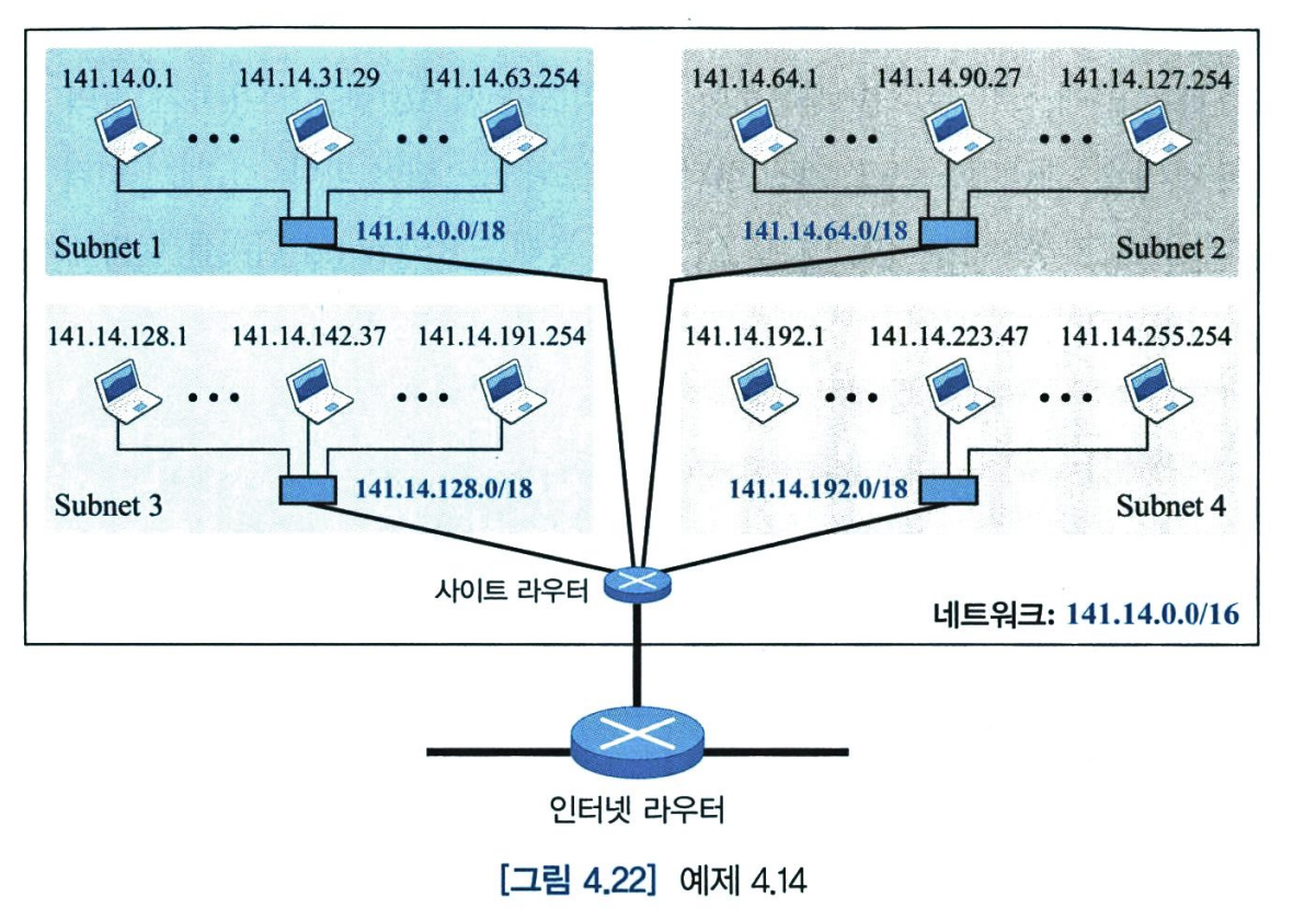 아래 그림은 위 네트워크로 서브넷팅을 구성한 예를 보여준다. 전체 네트워크는 같은 라우터를 통하여 인터넷에 연결된다. 그러나 아래 네트워크는 별도의 라우터를 사용하여 네트워크를 네 개의 서브넷으로 나누었다. 인터넷에서는 한 개의 네트워크로 보이지만 내부적으로는 네 개의 서브넷으로 구성되어있다. B클래스 이고 4개의 서브넷으로 나누므로 각 서브넷은 2**14개의 호스트를 가질 수 있다. 네트워크는 네 개의 서로 다른 학부(건물)를 가진 대한 캡퍼스에 속할 수 있다. 서브넷팅 후에 각 학부는 자신의 서브넷을 가지나 외부 네트워크에서는 전체 네트워크가 하나의 네트워크로 보인다. /16과 /18은 netid와 subnetid의 길이이다.