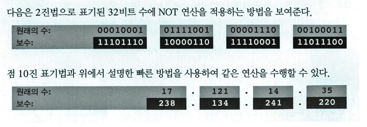 32비트 수에 NOT 연산을 직접 사용할 수 있지만, 수가 4바이트 점 10진법으로 표기되어 있다면 더 빠른 방법이 있다. 이는 각 바이트를 255에서 빼는 것이다.