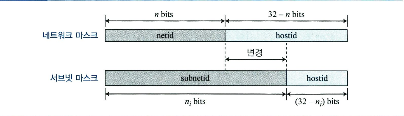 앞에서 네트워크 마스크(디폴트 마스크)에 대해 설명하였다. 네트워크 마스크는 네트워크가 서브넷팅되지 않은 경우 사용한다. 네트워크를 몇 개의 서브넷으로 나눌 경우 각 서브넷에 대해 서브넷 마스크(subnet mask)를 생성할 필요가 있다. 아래 그림과 같이 서브넷은 subnetid와 hostid를 가진다.