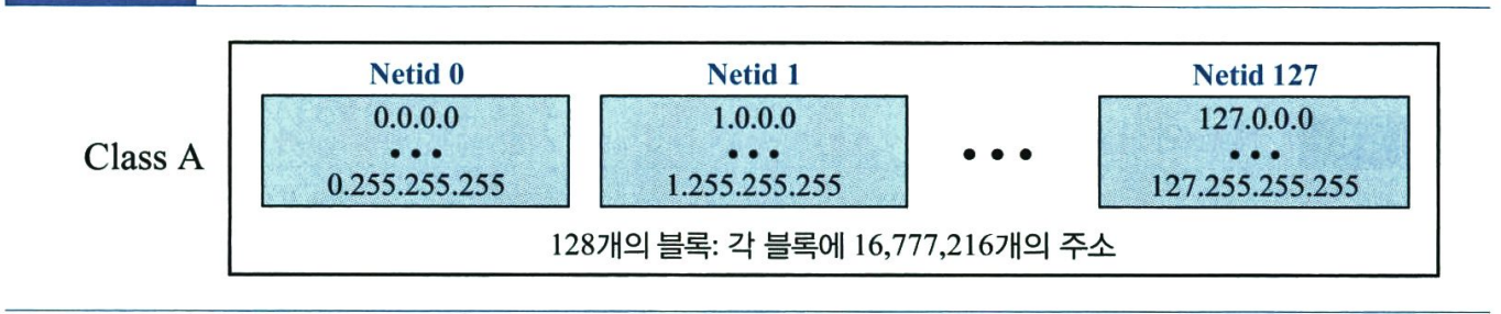 클래스 A에서는 1바이만 netid를 정의하고 가장 왼쪽 비트는 0이 되어야 하므로 다음 7비트는 이 클래스 내의 블록 수를 찾는데 사용된다. 그러므로 클래스 A는 2**7 = 128 개의 블록으로 나누어지고 이 블록은 128개의 기관에 할당될 수 있다. 그리고, 클래스 A의 각 블록은 16,777,216개의 주소를 가질 수 있으며, 이는 모든 주소를 사용하기 위해 기관 규모가 매우 커야 한다는 것을 의미한다. 이 클래스에서 많은 주소가 소진되었다. 아래 그림은 클래스 A의 블록들을 보여주고 있다.